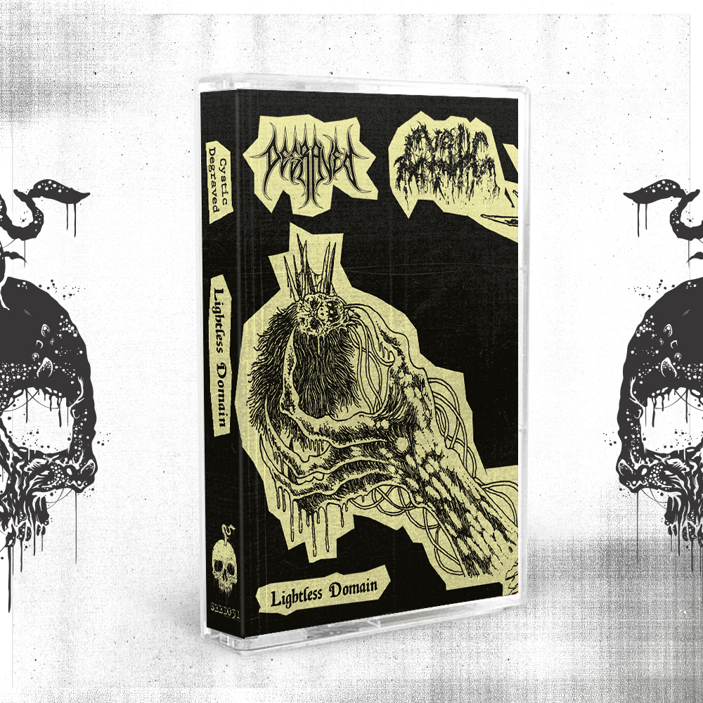 Limited edition cassette of Cystic / Degraved - Lightless Domain split Tape on Black cassette shell with yellow body print.